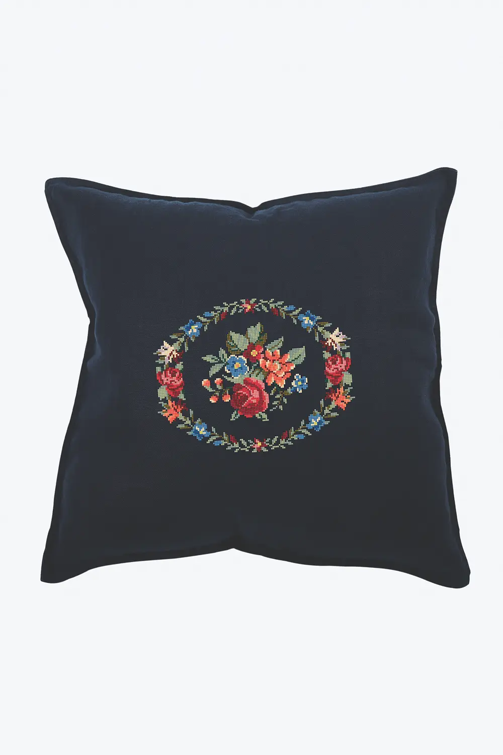 Un motif classique et traditionnel pour cette composition florale en médaillon qui sera du plus bel effet dans un cadre raffiné, sur un coussin ou encore un sac de toile.