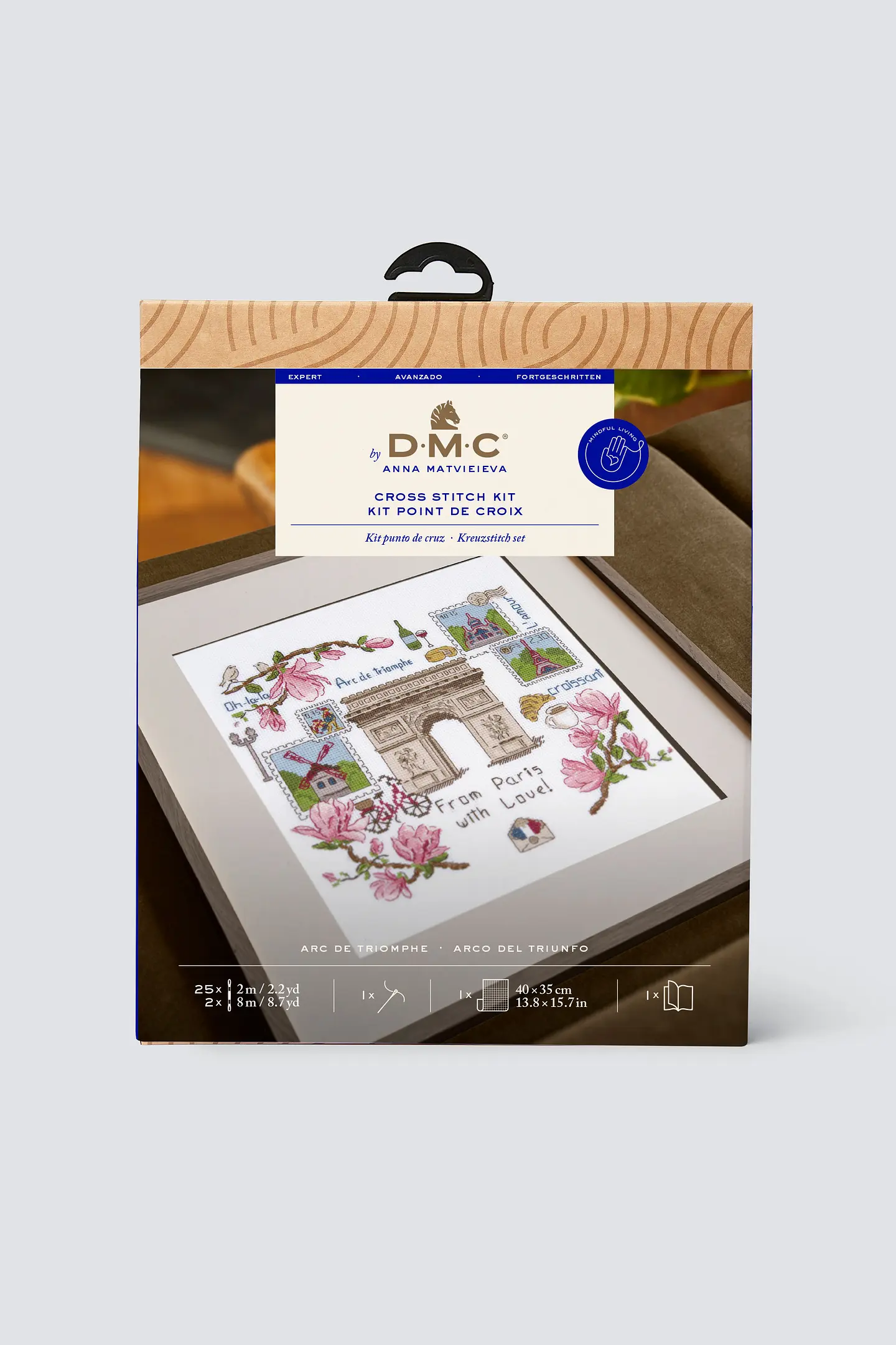 This design by Anna Matvieieva features the structure of the Arc De Triomphe surrounded by magnolia blossoms and symbols of Paris. It’s a romantic, traditional style cross stitch. Stitched on 14-count 5.5 pts/cm 100% cotton Aida. The kit has everything you need to get stitching including DMC’s iconic Mouliné Spécial stranded embroidery thread. For help with any of the stitches visit the step-by-step diagrams and video tutorials on our website.